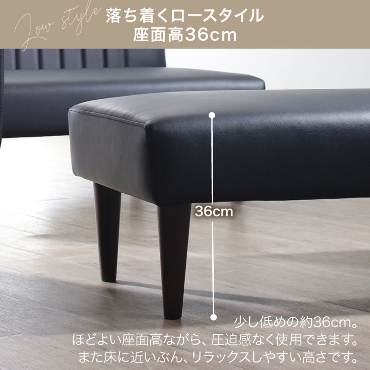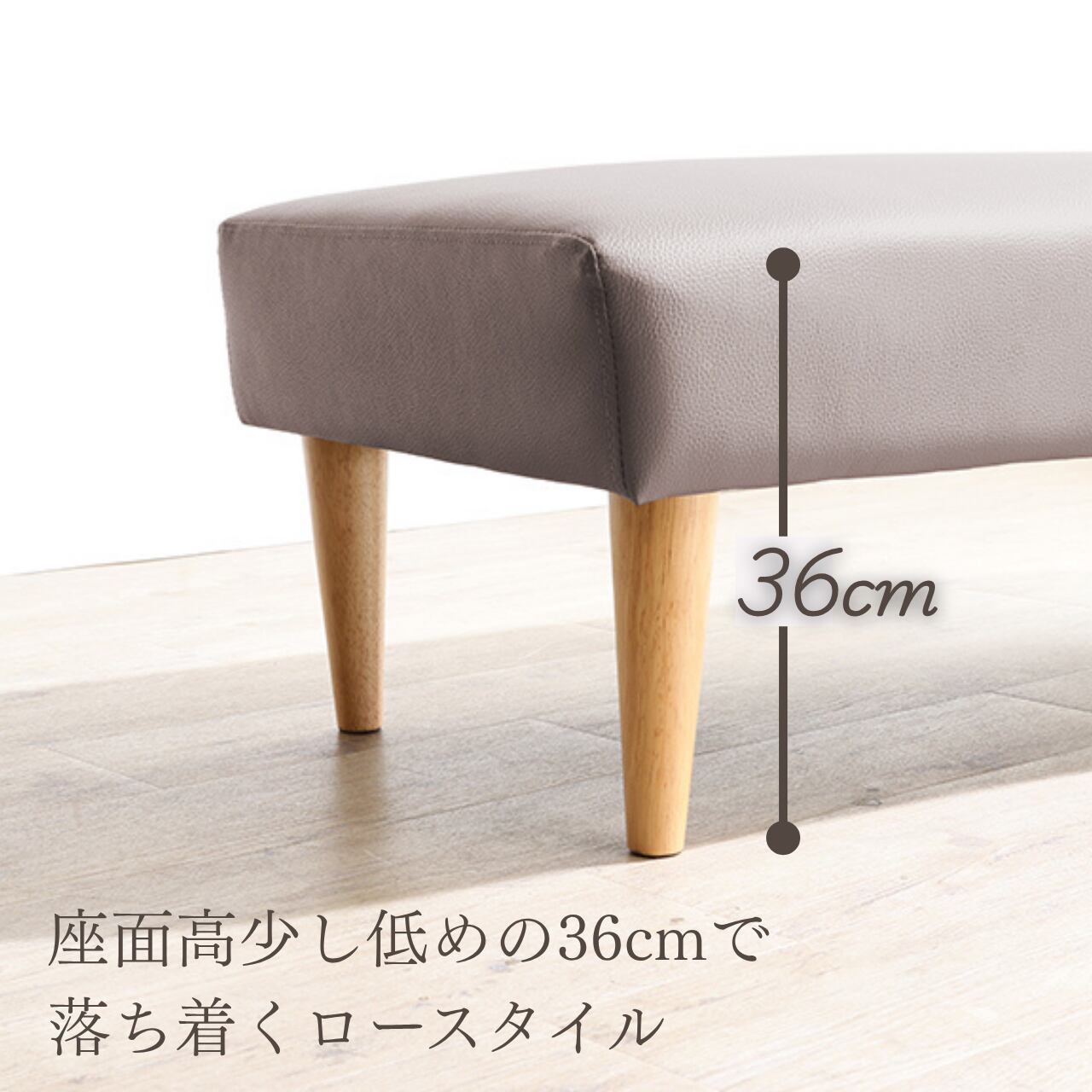 座面には、汚れや水分に強いPVCレザーを採用。日々のお手入れもサッと拭くだけで簡単に清潔さを保てます。座面高は約36cmとやや低めに設計されており、圧迫感を感じにくく、床に近い高さが自然とリラックスした時間を生み出します。
