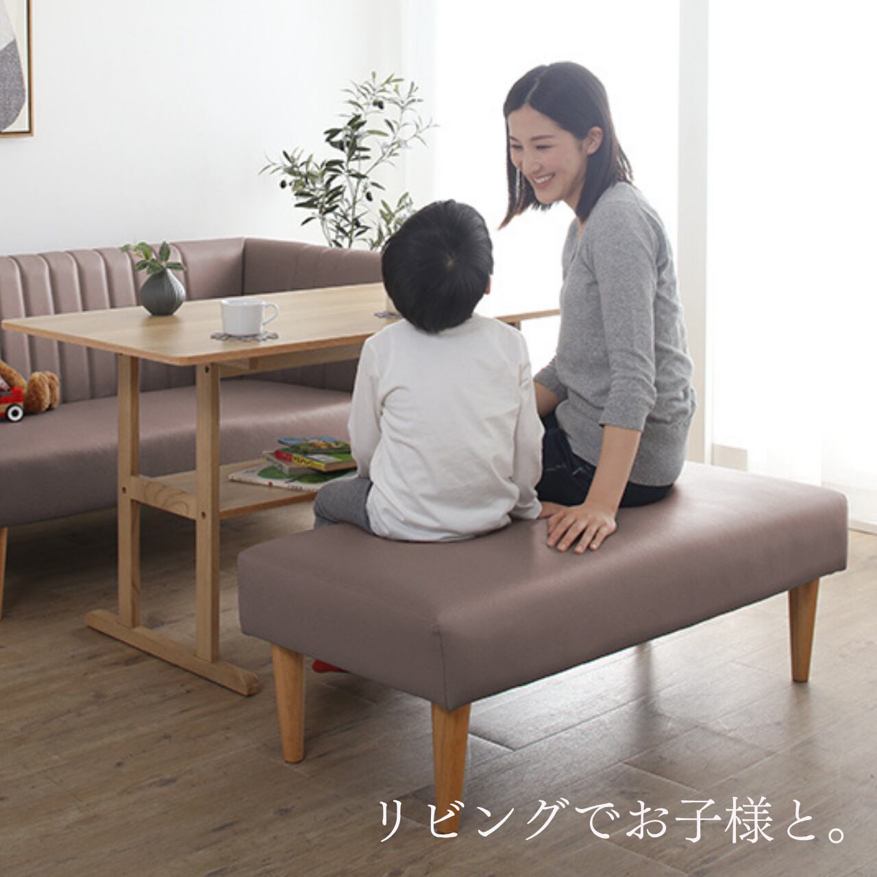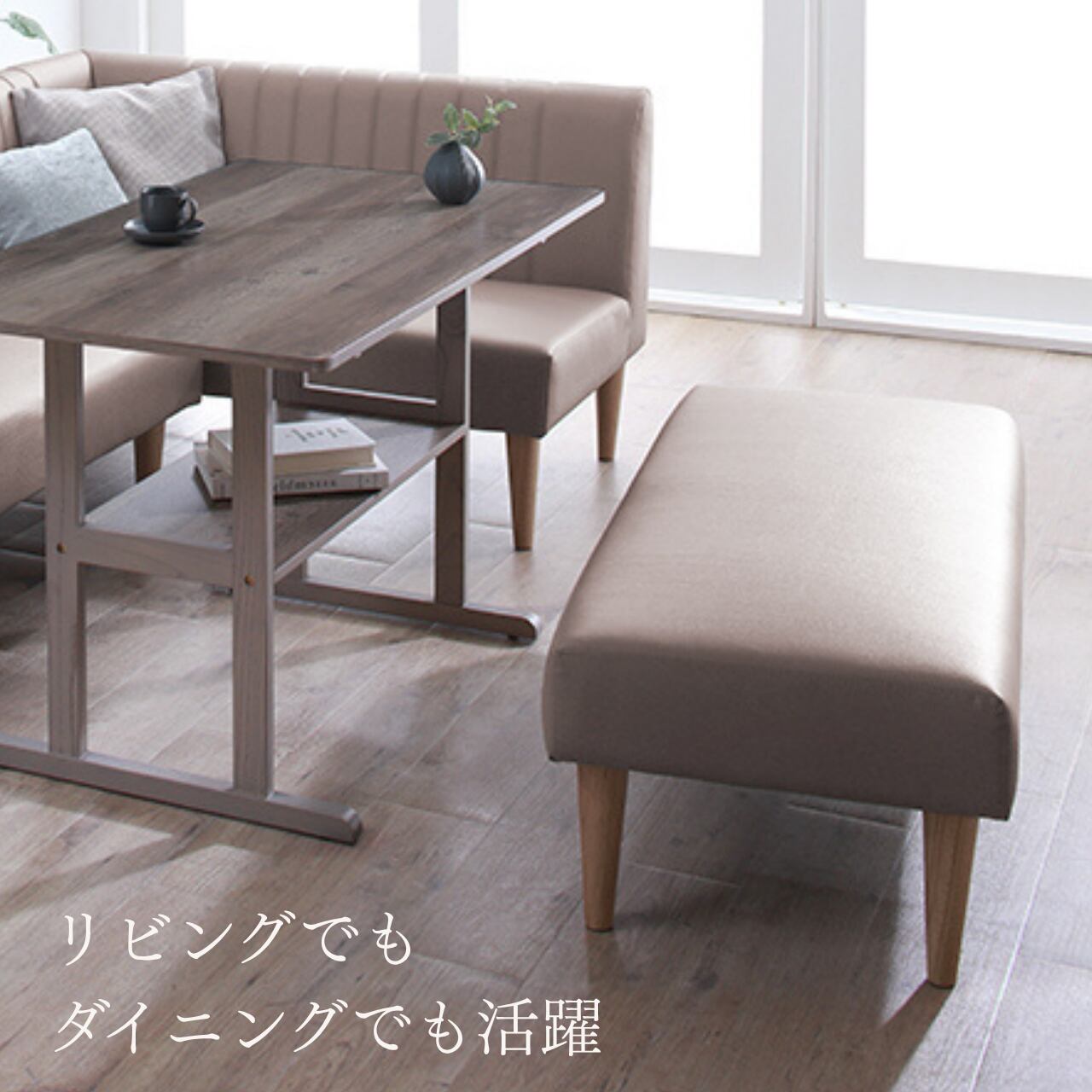 リビングでもダイニングでも、さまざまなシーンで活躍するロースタイルのデザインベンチです。優しい色合いのグレージュカラーは、どんなインテリアにも自然と馴染み、お部屋を上品に彩ります。
