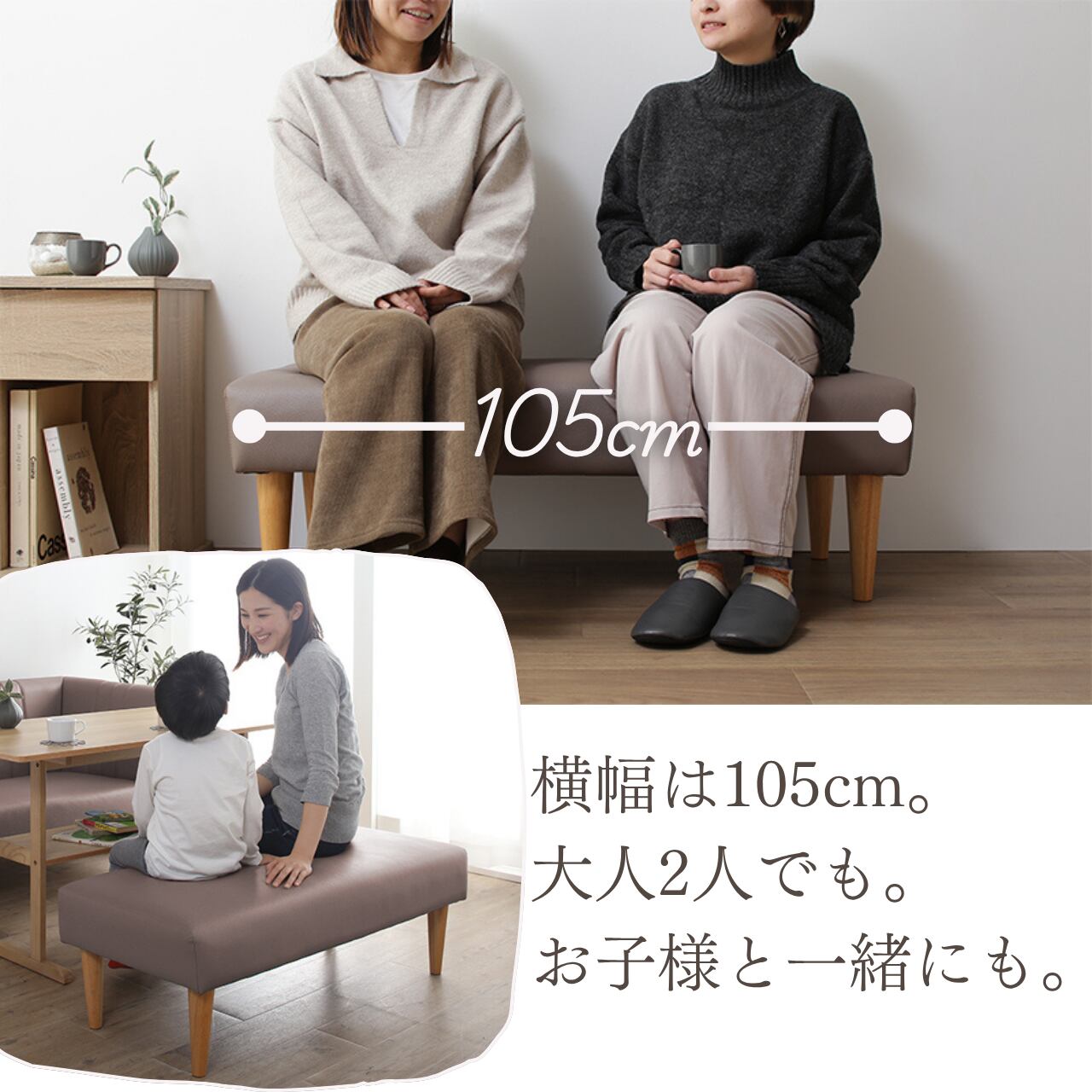 大人二人がゆったり座れる広さに加え、お子さまでも一人で座りやすい設計。家族や友人と囲む楽しいひとときにぴったりの一台です。軽量で移動もしやすく、リビングはもちろん、ダイニングや玄関、ちょっとした作業用の腰掛けとしても活躍します。