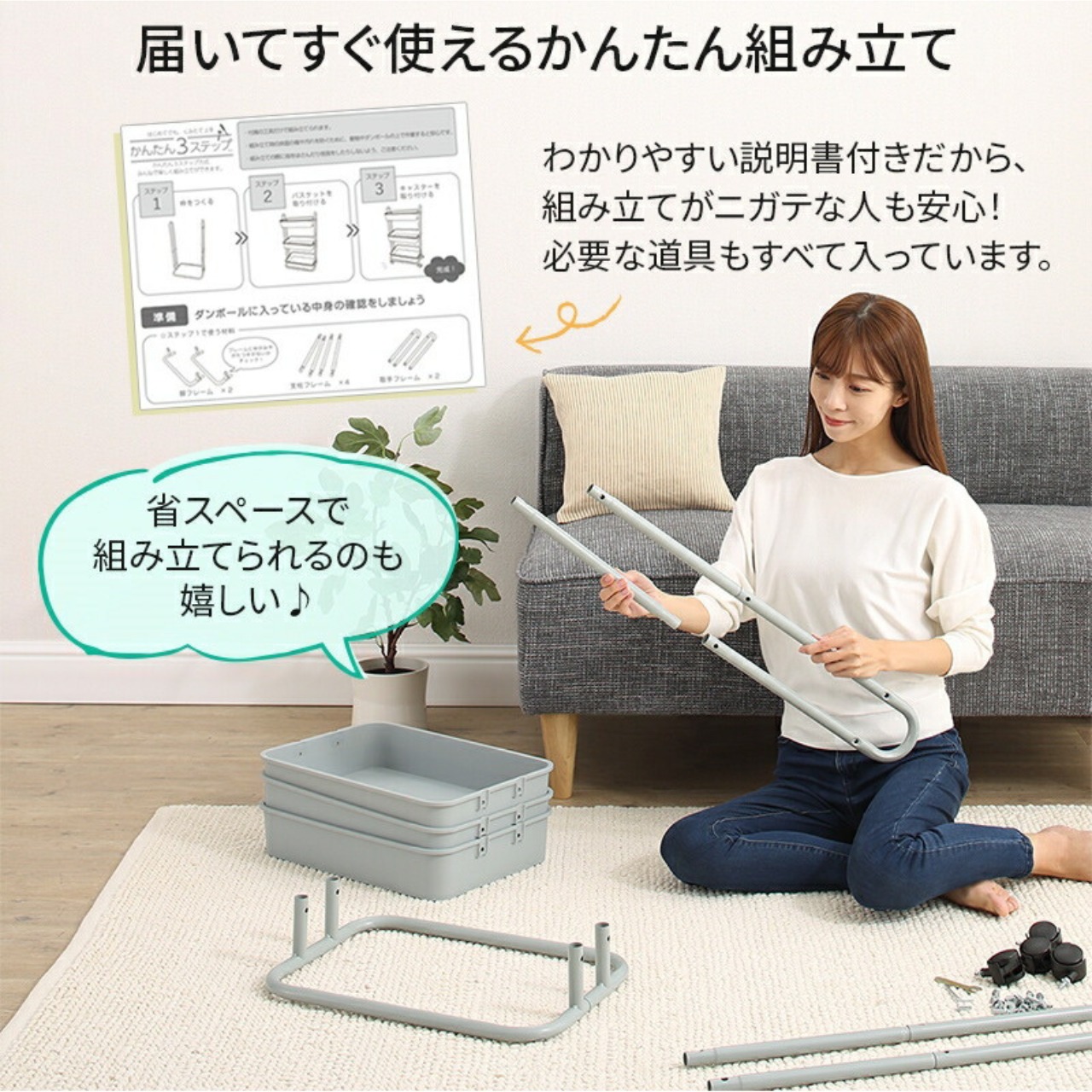 届いてすぐ使えるかんたん組み立て設計です。わかりやすい説明書付きだから、組み立てがニガテな人も安心!必要な道具もすべて入っています。