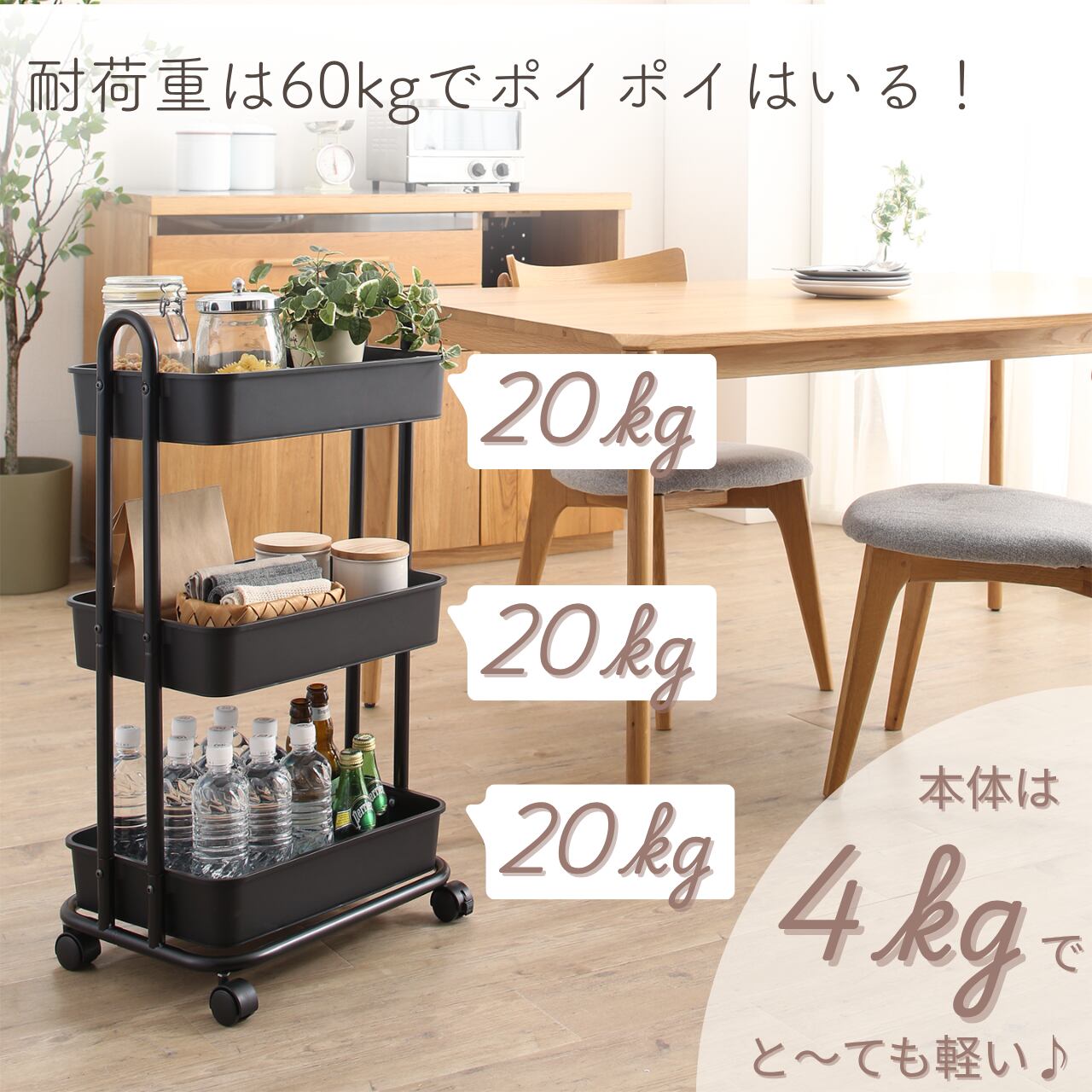 バスケットトローリー収納ワゴンは、収納力と機動性を兼ね備えた優れたアイテムです。約4kgと女性が片手でひょいっと持てる軽い作りながらも耐荷重は計(約)60kg!頑丈で、日常のさまざまなシーンで活躍します。キャスター付き&便利な取っ手付きだから、移動も楽々。キャスターには、もちろんストッパーがついているので、定位置でしっかり止まります。リビングからキッチン、さらにはお子様の遊び場まで、どこでもスムーズに運べて、使えます。雑誌やおもちゃ、キッチン用品の整理整頓に最適です。