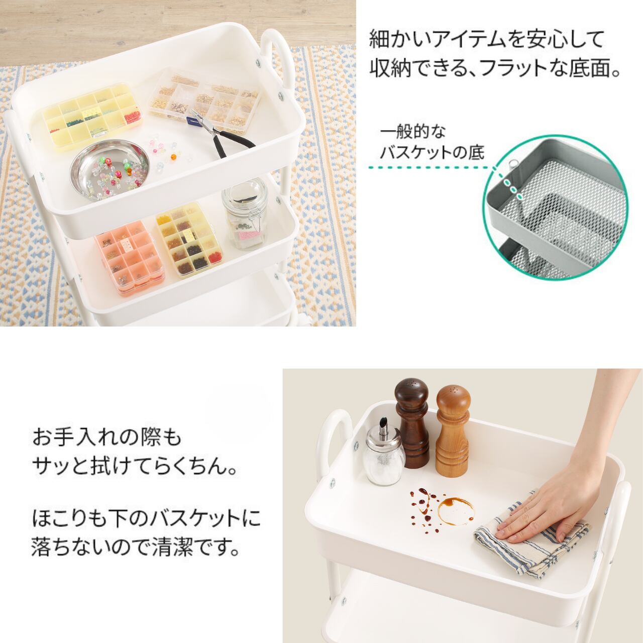 ワゴンの脚がバスケットの外側にでていない設計も、扱いやすさの理由。狭いスペースにもぴったりおさまります。